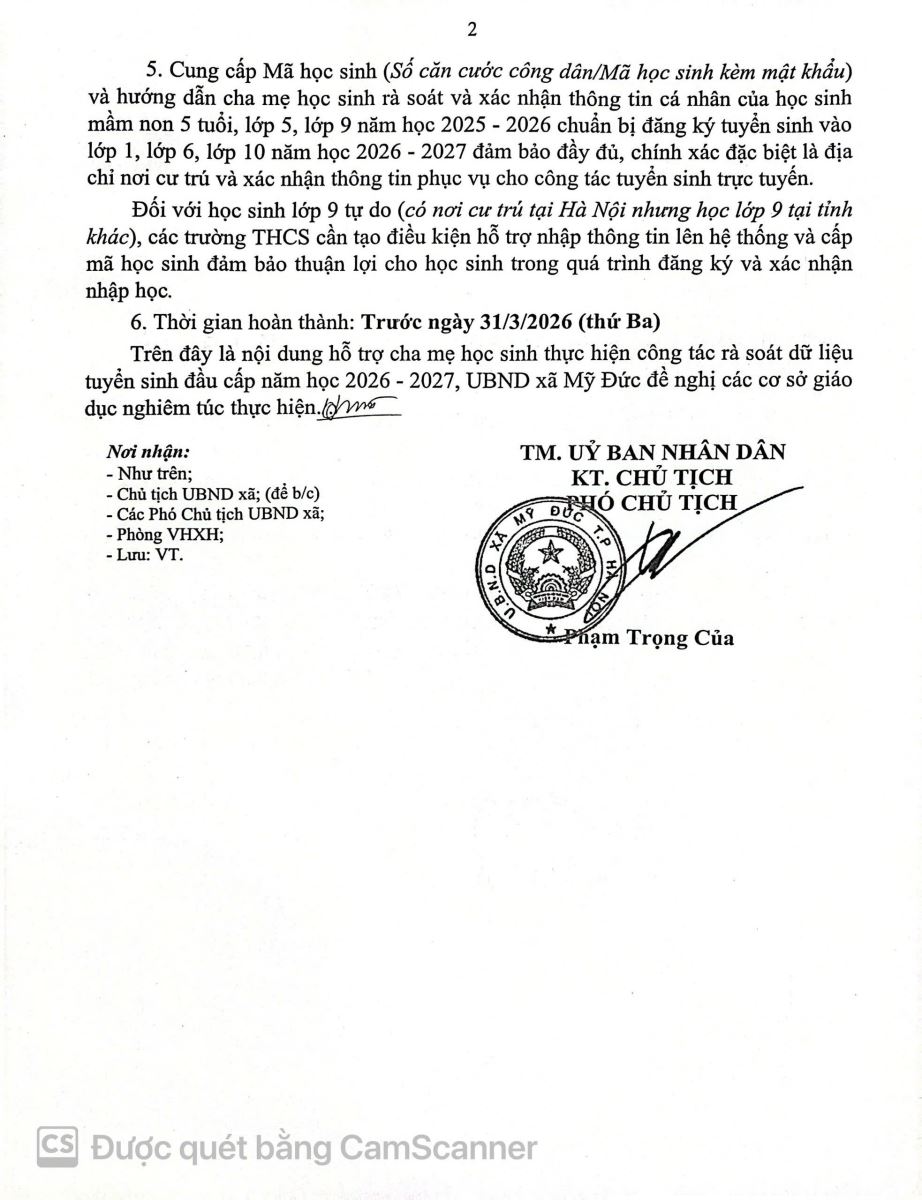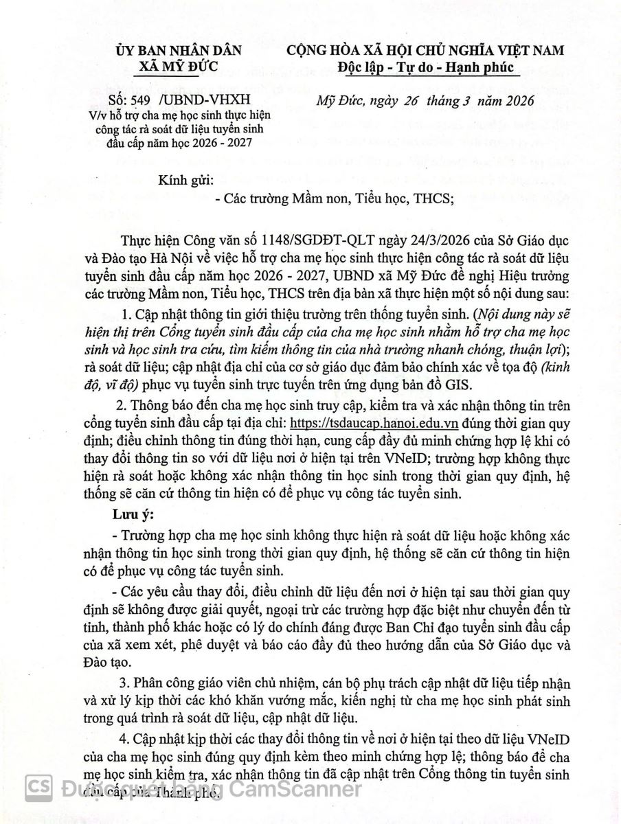 27/03/2026 A- A A+ | Trường Mầm Non Đại Hưng thông báo về việc thực hiện công tác rà soát dữ liệu tuyển sinh đầu cấp năm học 2026 2027 6. PHHS_HD_Rà soát - xác nhận thông tin hồ sơ tuyển sinh đầu cấp_V1_012026.pdf Xem Chia s? THÔNG BÁO: Rà soát dữ liệu tuyển sinh đầu cấp năm học 2026 - 2027 Kính gửi Quý phụ huynh học sinh Thực hiện kế hoạch tuyển sinh của Sở Giáo dục và Đào tạo, nhằm chuẩn bị tốt nhất cho công tác tuyển sinh vào các lớp mầm non năm học 2026 - 2027 Trường Mầm Non Đại Hưng trân trọng thông báo đến Quý phụ huynh về việc rà soát và đối chiếu thông tin dữ liệu của học sinh. Việc rà soát này đóng vai trò quan trọng giúp đảm bảo quyền lợi cho các con và giúp nhà trường chủ động trong công tác phân lớp, chuẩn bị cơ sở vật chất. 1. Đối tượng thực hiện • Phụ huynh có con em trong độ tuổi tuyển sinh vào trường năm học 2026 - 2027 2. Nội dung rà soát thông tin Quý phụ huynh vui lòng kiểm tra kỹ các thông tin sau: • Thông tin cá nhân: Họ và tên, ngày tháng năm sinh, giới tính. • Thông tin cư trú: Địa chỉ thường trú, nơi ở hiện tại (số nhà, tổ/thôn). • Thông tin liên lạc: Số điện thoại của cha/mẹ hoặc người giám hộ. • Mã định danh cá nhân: (Nếu có yêu cầu từ hệ thống tuyển sinh trực tuyến). 3. Hình thức Phụ huynh thực hiện trực tuyến qua cổng thông tin : https://tsdaucap.hanoi.edu.vn Đúng thời gian quy định , điều chỉnh thông tin đúng thời hạn, cung cấp đầy đủ minh chứng hợp lệ khi có thay đổi thông tin với dữ liệu nơi ở hiện tại trên VNeID; trường hợp không thực hiện rà soát hoặc không xác nhận thông tin học sinh trong thời gian quy định, hệ thống sẽ căn cứ thông tin hiện có để phục vụ công tác tuyển sinh. Nhà trường rất mong nhận được sự phối hợp kịp thời của Quý Phụ Huynh để công tác tuyển sinh diễn ra thuận lợi và đúng quy định. Tập tin đính kèm Tải về